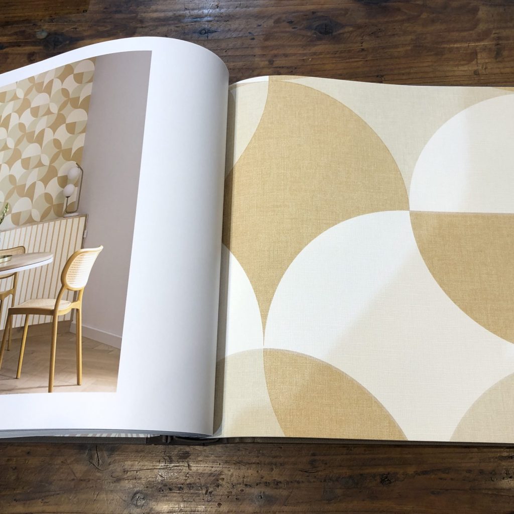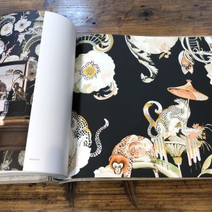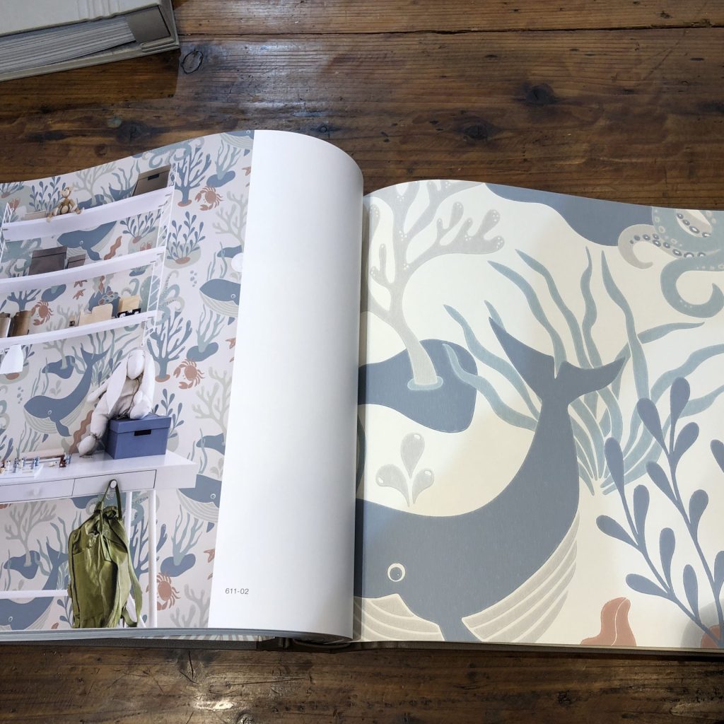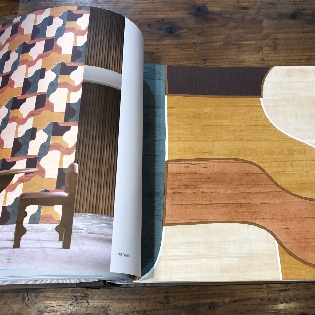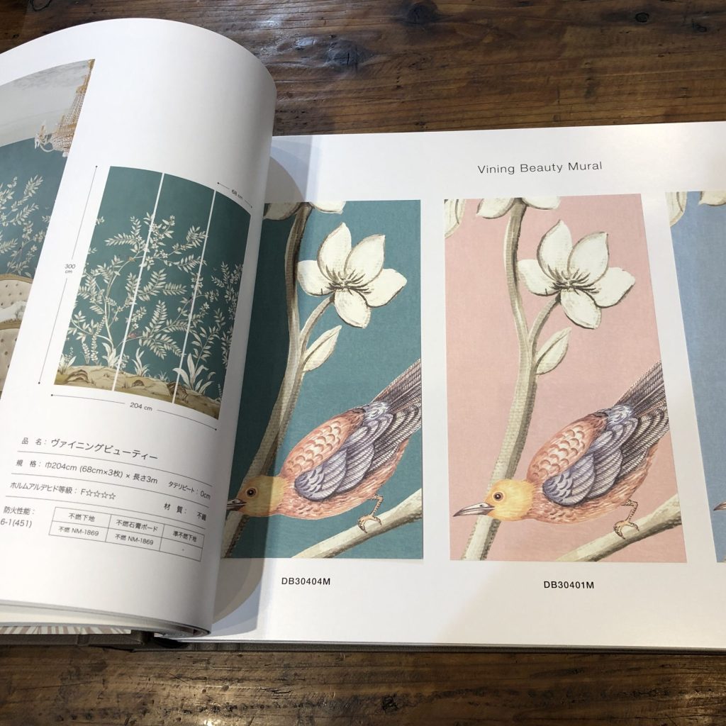 無地、花柄、幾何学模様等、色とりどりの美しいデザインの壁紙が綴じられています。